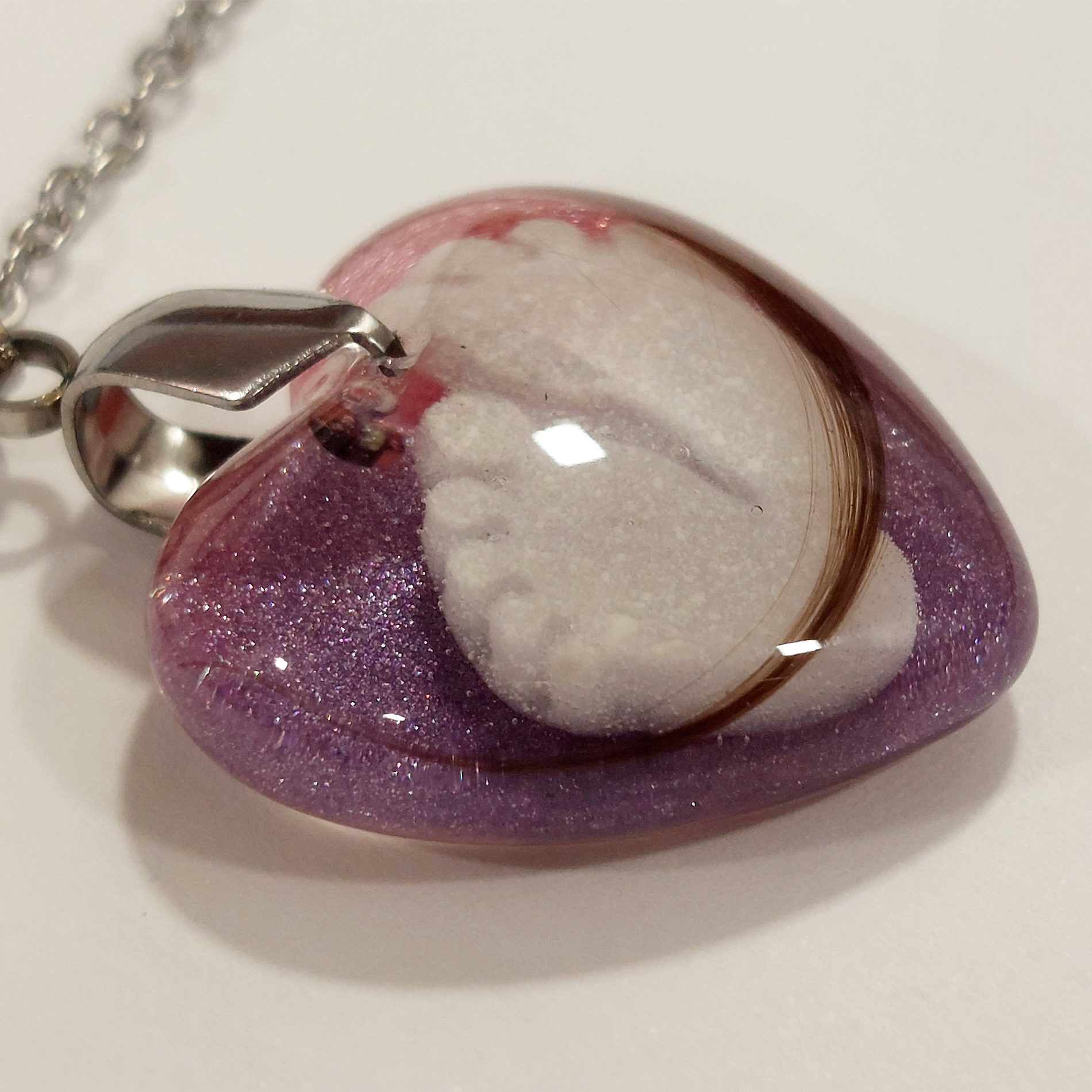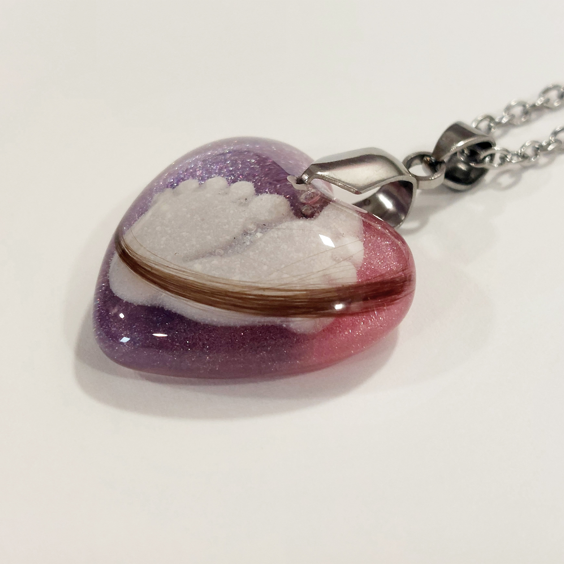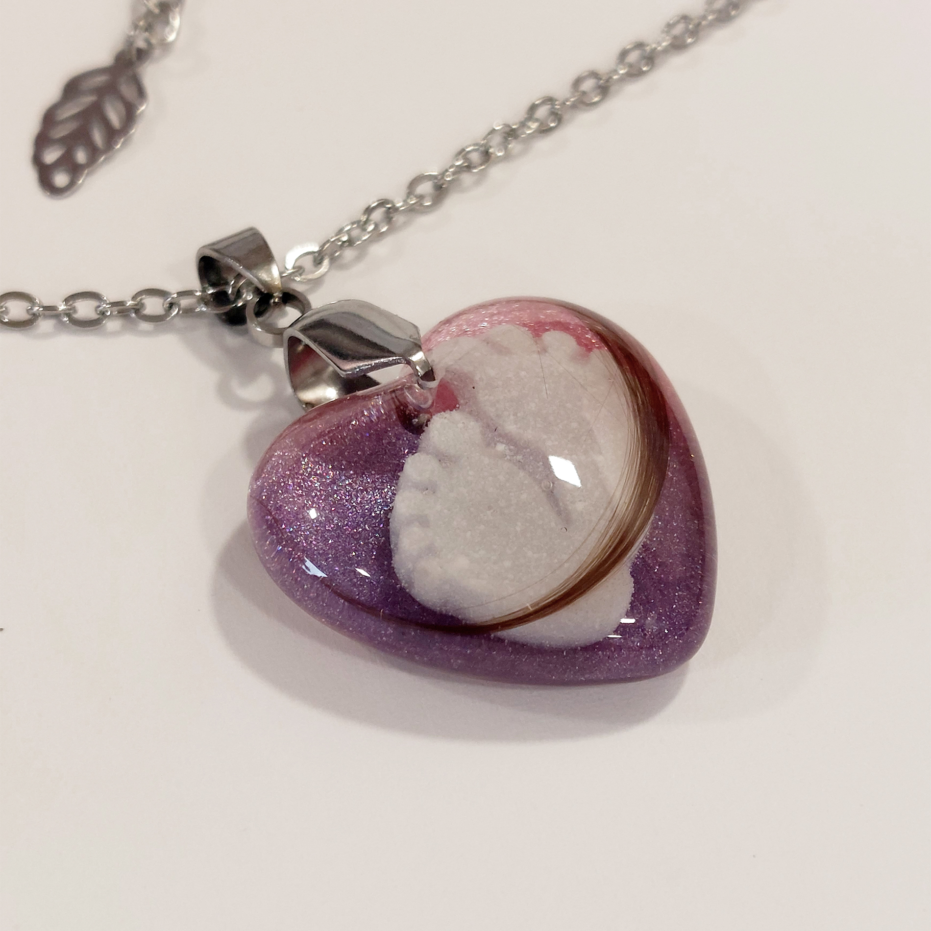 Transparentni obesek z otroškimi laski in bleščicami je nežen in edinstven spominski nakit, ki nosi globok pomen. V njem so skrbno ujeti otroški laski, obdani z bleščicami, v katerih so čudovito oblikovane nogice iz materinega mleka. Ta obesek predstavlja ljubezen, povezanost in dragocene trenutke materinstva, ki jih lahko nosite vedno s seboj.